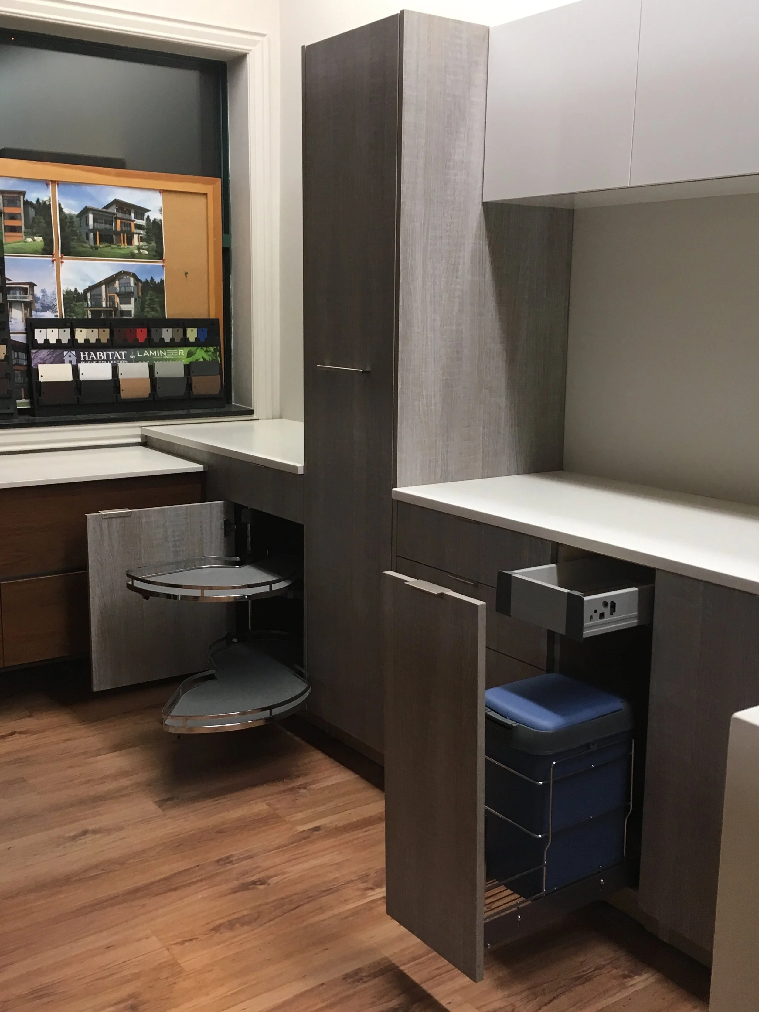 Come visit our showroom in Whistler where you can explore the many options available to you at CanWest Cabinetry. Browse through knobs + handles, door + drawer faces, materials + hardware, built-in pantries, recycling units, drawer inserts, blind corner storage systems, and more. Enjoy a hands-on experience that allows you to be involved in planning every detail of your dream kitchen, bathroom, or closet system.